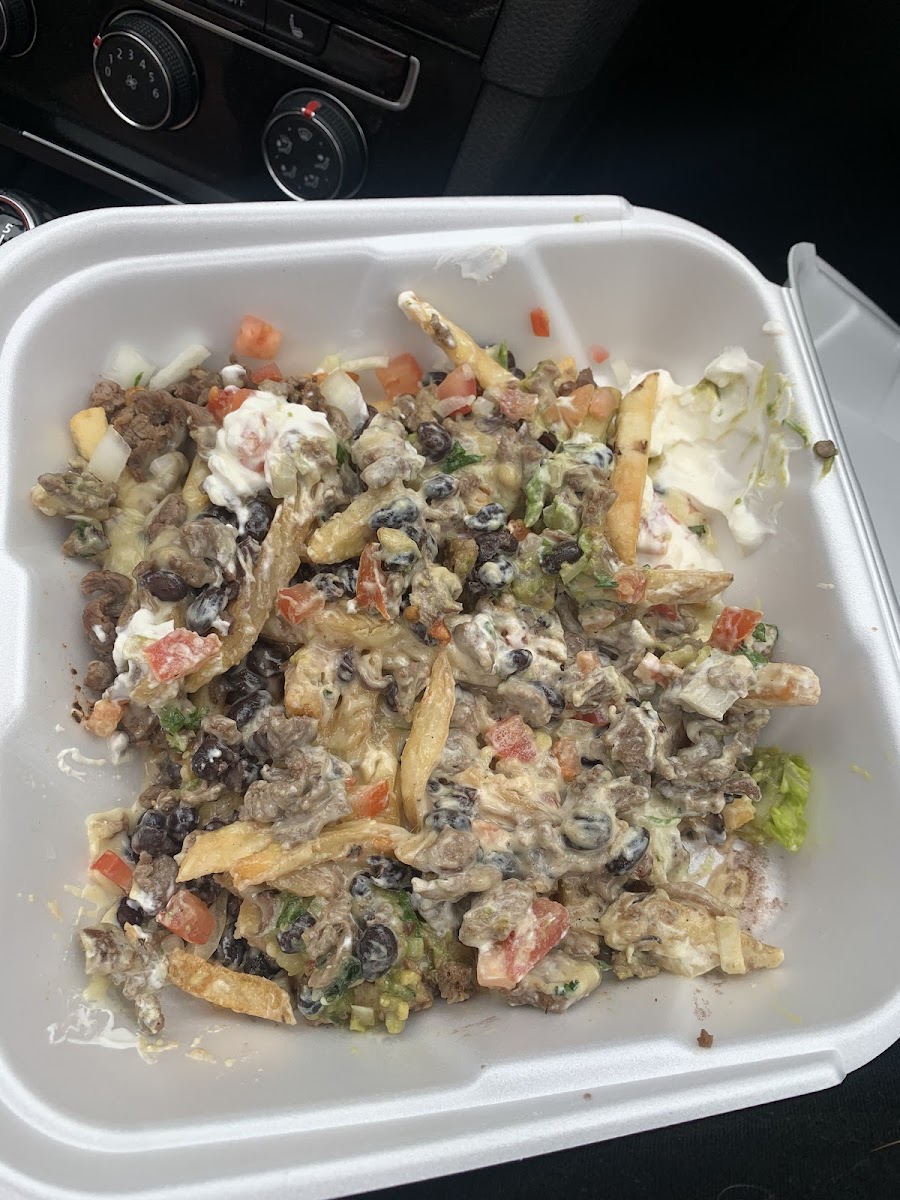 Black beans, choice of meat, drizzled with queso blanco, topped with onions, tomatoes, sour cream, and guacamole.